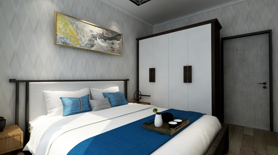 對于臥室來講沒有局限于傳統的暖色調,而是用了稍許冷色配上中式家具,讓空間更顯得安靜祥和,灰色的墻面也使得空間更顯飽滿,增加了舒緩的氛圍。